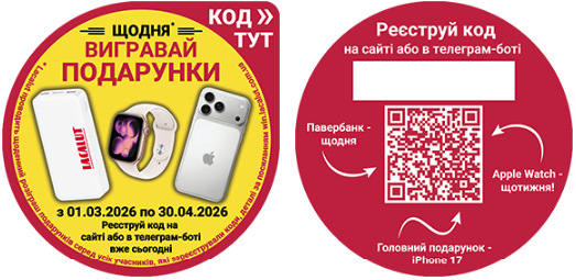 На Акційній продукції обов’язково є наліпки з інформацією про акцію та Унікальним кодом, який знаходиться на лицьовій частині пакування.