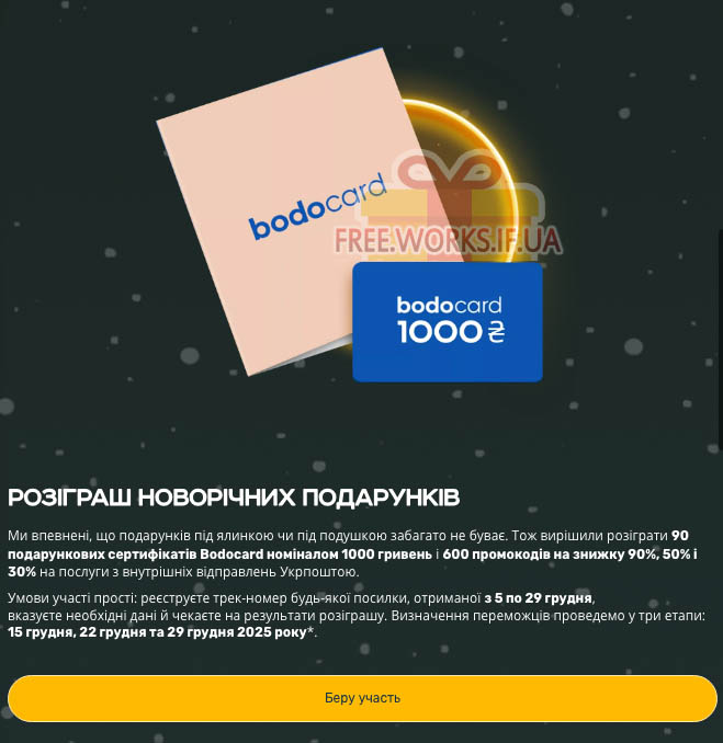 3. Розігрується 90 подарункових сертифікатів Bodocard номіналом 1000 гривень і 600 промокодів на знижку 90%, 50% і 30% на послуги з внутрішніх відправлень Укрпоштою.