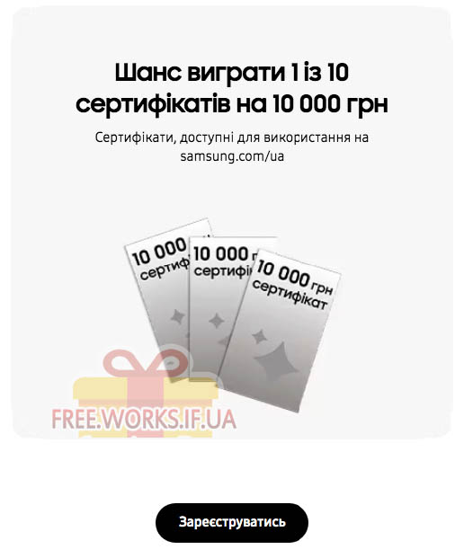 Подарунковий фонд: сертифікат номіналом 10 000 грн на придбання будь-яких товарів в офіційному інтернет-магазині Samsung https://www.samsung.com/ua/ — 10 шт.