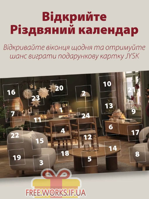 З 1 по 24 грудня 2025 року щодня відкривайте віконця Різдвяного календаря JYSK — вигравайте подарункові картки на 700 грн від JYSK та беріть участь у розіграші головного призу — подарункової картки на 12 500 грн.